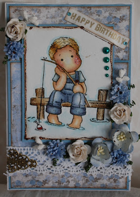 Tilda är färglagd med distress refillers. På hennes krona sitter lite stickles - icicle. Bredvid henne har jag satt rosa och blå rhinestones och på båda sidorna sitter ljusrosa halvpärlor. Runt har jag stämplat med en swirlstämpel.